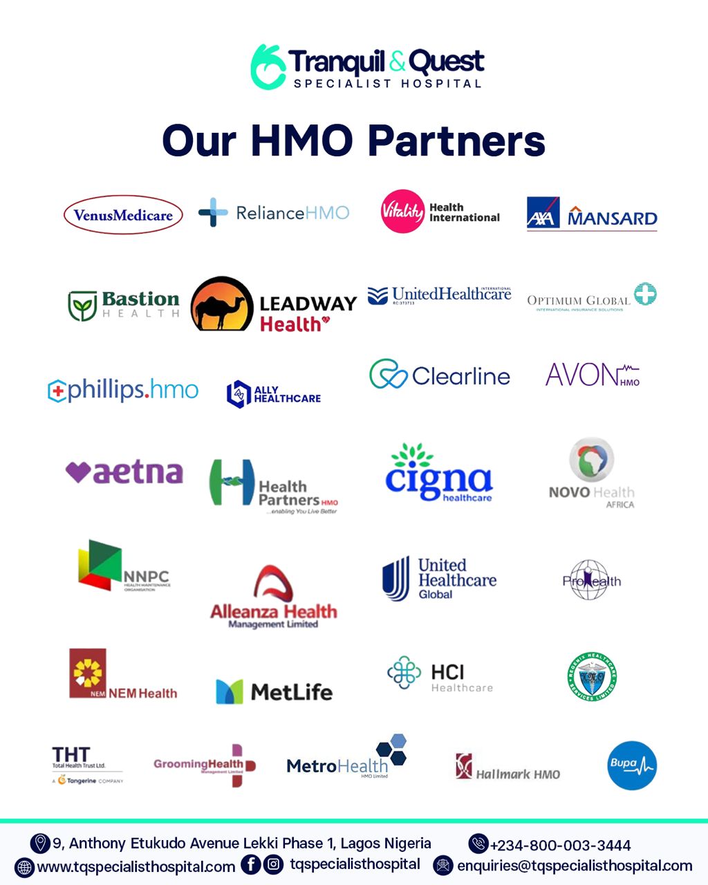 Access to quality healthcare should never be limited by financial constraints. That’s why Health Maintenance Organizations (HMOs) play a vital role in ensuring patients receive affordable and timely medical care. At Tranquil & Quest Specialist Hospital, we collaborate with trusted HMO providers to make healthcare more accessible for our patients.