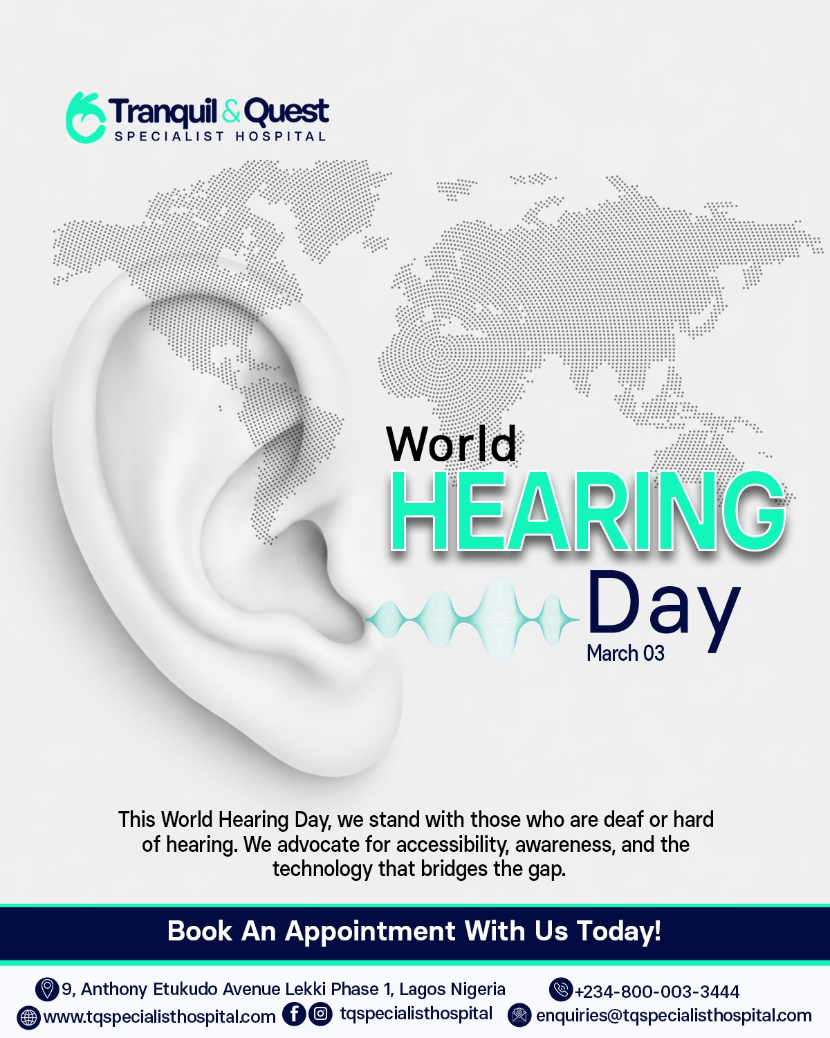 World Hearing Day is observed each year to promote awareness about hearing loss and the importance of ear and hearing care. Millions of people worldwide live with hearing challenges, many of which could be prevented through early detection and proper care. At Tranquil and Quest Specialist Hospital (TQSH), we support global efforts to improve hearing health and accessibility.